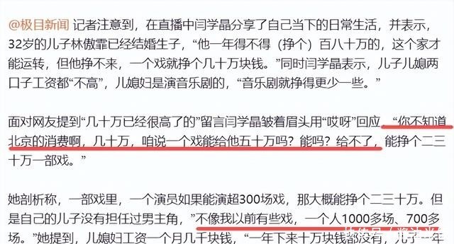 同时闫学晶表示,儿媳妇是演音乐剧的,音乐剧就挣得更少一些。